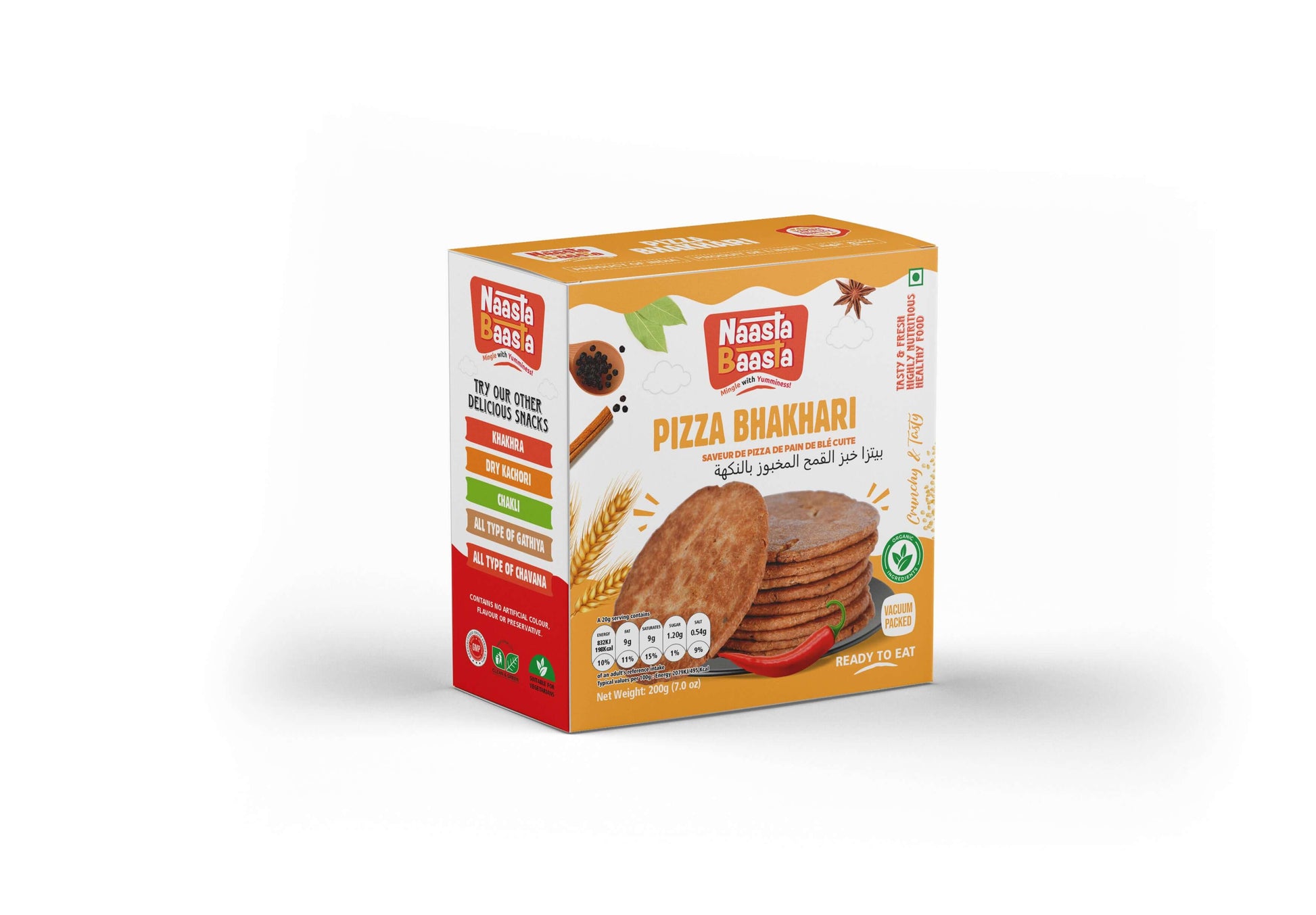 Naasta Baasta Pizza Bhakhari brings the exciting flavors of pizza into a crunchy, ready-to-eat snack. Infused with pizza-inspired seasoning, this bhakhari is a perfect blend of savory spices and crispy texture. Vacuum-packed to retain its freshness, this 200g pack is ready to eat, making it an ideal snack for any time of the day.